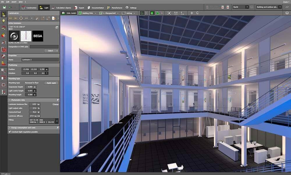 Rhein Lighting benutzt die professionelle Lichtplanungssoftware DIALux. Egal ob für Innen- oder Außenbeleuchtungen, DIALux zeigt Ihnen jederzeit einen professionellen Lichtplan, der Ihren individuellen Anforderungen entspricht. Mithilfe modernster Computertechnologie können Sie ihre Veränderungen im Programm verfolgen. Damit haben Sie die Möglichkeit, die Effekte Ihrer Beleuchtungslösung noch vor Ihrer Investition anzusehen.